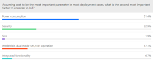 The poll results further highlight the necessity for dual-mode capabilities as the new generation of IoT networks are rolled out. Supporting higher throughput, CAT-M1 generally provides lower active power consumption than NB1. However, in poor coverage scenarios, NB1 will provide lower power consumption levels, thanks to its ability to support single-tone transmission. Thus, a dual-mode CAT-M1/NB1 chipset will prove decisive in ensuring maximum power efficiency for future IoT deployments. Additionally, dual-mode operation is necessary to ensure global coverage, especially when mobile network operators’ Cat-M1/NB1 roll-out plans are not yet finalized.